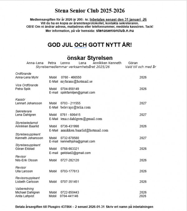 Årsavgiften för 2026 fastställdes till SEK 200:- att betala innan januaris utgång.